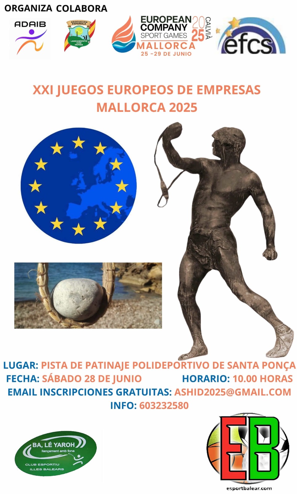 Se abre la inscripción para el campeonato en los XXI Juegos Europeos, por primera vez el lanzamiento con honda (Tir de Fona), para los honderos es totalmente gratuito… Es la primera vez en la historia que el lanzamiento con honda, está en unos juegos europeos, junto a 33 disciplinas deportivas y con más de 5.400 atletas… Es la una oportunidad única, es un Deporte de Empresa, que al final quien mantiene el deporte son las empresas…aquí no intervienen las Federaciones deportivas… Por ello, ruego que vosotros mismos sopeséis si os interesa participar,.. La inscripción estará abierta hasta el día 26 de junio, os recuerdo que al ser de empresa, pueden participar desde los 16 años las inscripciones se puede hacer en la web de ASHID O POR WASAP AL TELEFONO 603232580 o al correo ashid2025@gmail.com